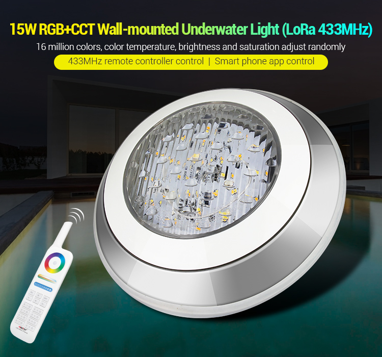 Podvodní bazénové RGB+CCT LED svítidlo 12V-24V Mi-Light LoRA 433MHz s výkonem 15W a s vodotěsným krytím IP68.