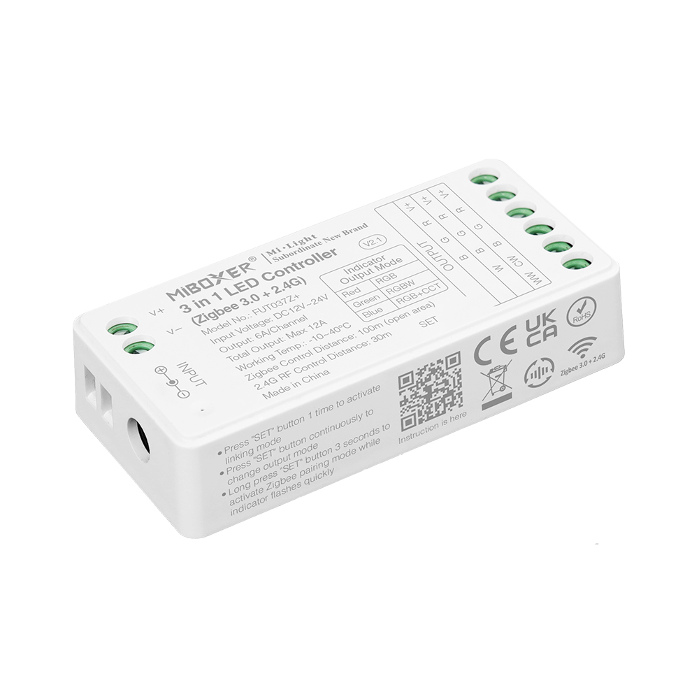 Univerzální 3v1 řídící jednotka Mi-Light ZigBee 3.0 ML037Z+ pro RGB, RGBW a RGB-CCT pásky 12V-24V, 12A - 144W/288W. Jednotka umožňuje ovládání přes protokol ZigBee 3.0. nebo ovladači řady Mi-Light z naší nabídky.