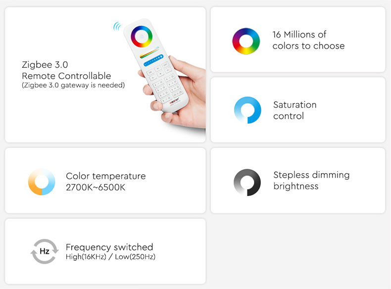 Kompatibilita ZigBee produktů z naší nabídky se systémy chytré domácnosti otevírá nové možnosti použití, jako příklad lze uvést drahé a málo výkonné LED pásky Philips HUE. Ty nyní můžete snadno nahradit za libovolné LED pásky z naší široké nabídky, které nabízí vyšší světelný výkon, volba počtu diod/metr, různé stupně voděodolnosti nebo třeba individuální úprava pásky na míru. Obdobná situace je se svítidly, kdy odpadá omezeni sortimentem konkrétních výrobců. Mezi standardní funkce řízení svítidel patří funkce zapnout/vypnout, stmívat a řídit intenzitu (v případě RGB, RGBW, nebo CCT i barvu) dle naprogramované scény. V naší nabídce naleznete kompletní řadu ZigBee 3.0 řídících jednotek od Mi-Light, která jsou přímo určena pro ovládání jednobarevných LED pásků, CCT pásků, RGB pásků, RGBW pásků a RGBCCT pásků.